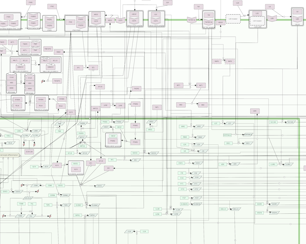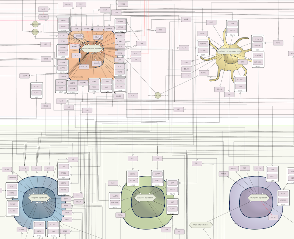 The ISD map is a network of atopic dermatitis (AD)- and psoriasis (PsO)-specific causal molecular interactions represented as computable diagrams. It is available as a set of interactive diagrams, similar to canonical pathway databases, but focused on AD and PsO mechanisms. The ISD map can be used for data interpretation, hypothesis generation and simulation modelling.