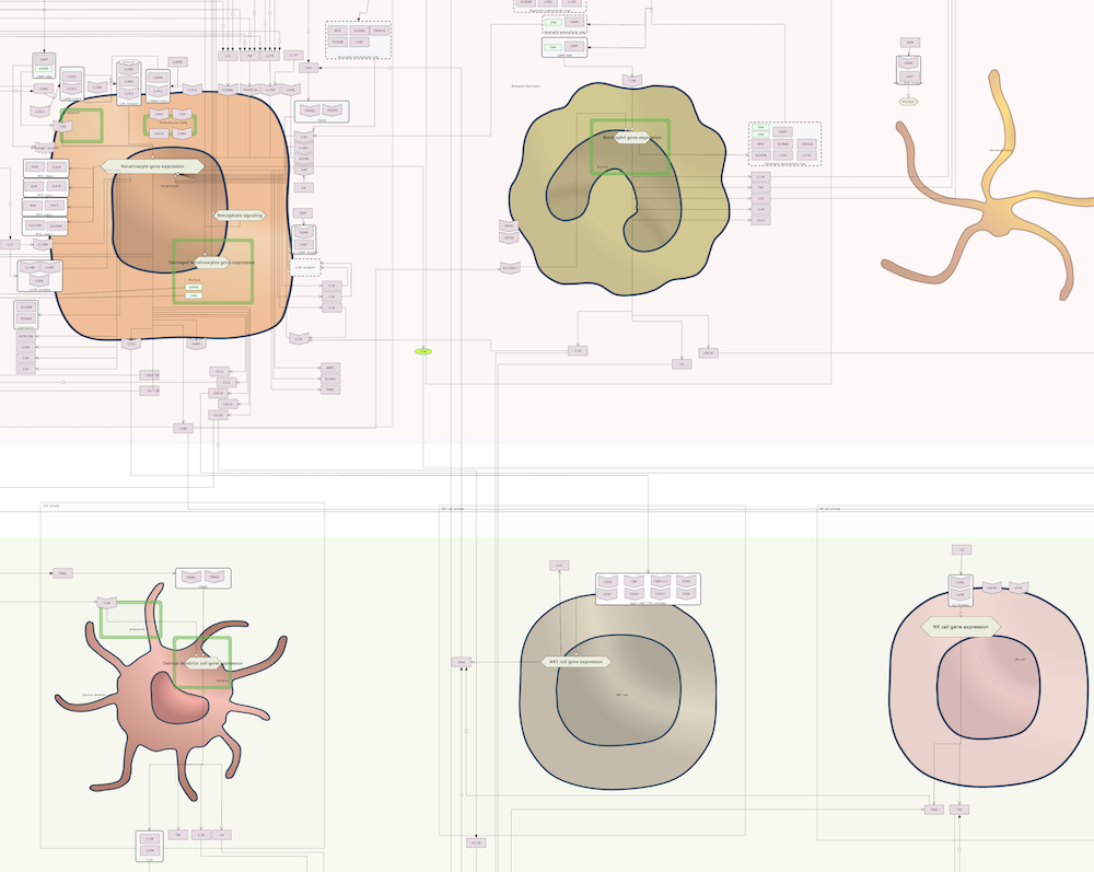 The map is comprised by three layers: a side-by-side layer that is the entry point for the ISD map and contains the key molecules and cells associated with AD and PsO, the intercellular communication views depicting how AD and PsO-relevant cell types interact, and the intracellular pathways layer illustrating signalling networks within some selected cells.