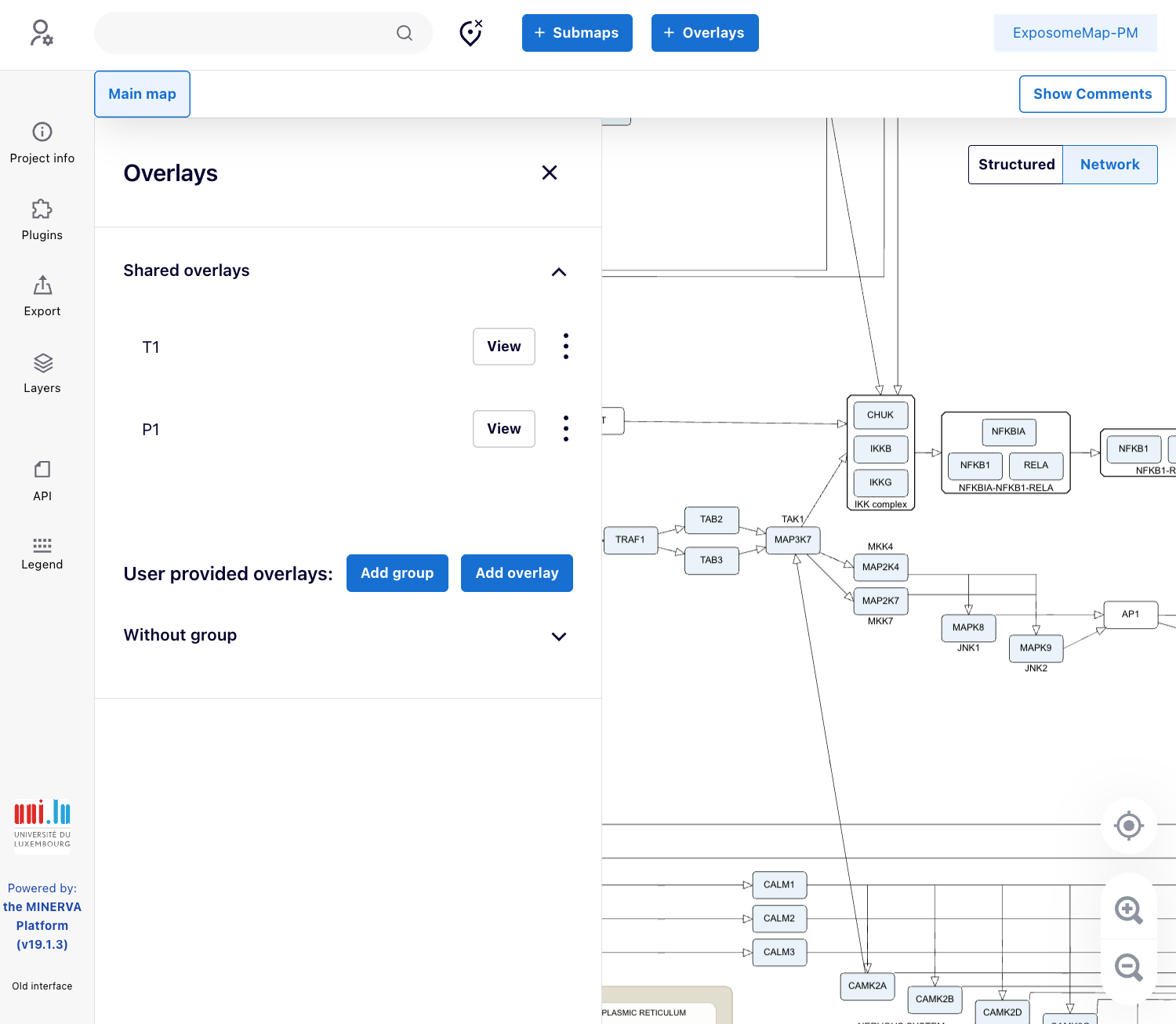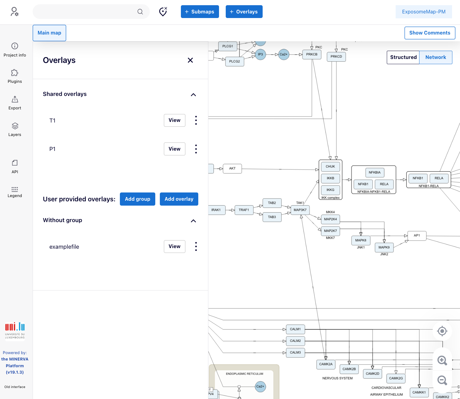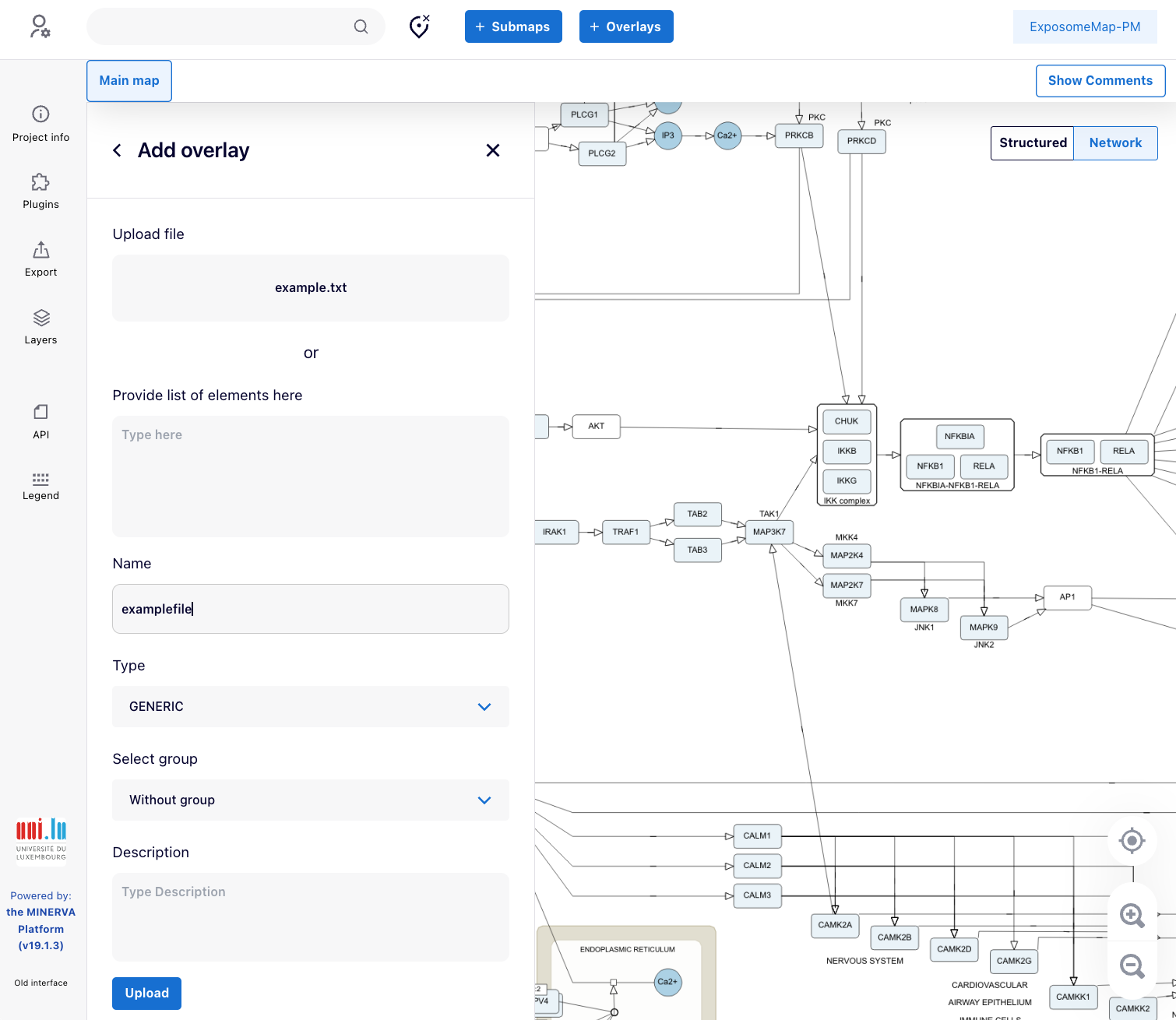 This page offers step-by-step instructions on uploading a custom data overlay to ExposomeMap-PM on the MINERVA platform, covering file preparation and upload process. A general guide to the MINERVA Platform is available at https://minerva.pages.uni.lu.